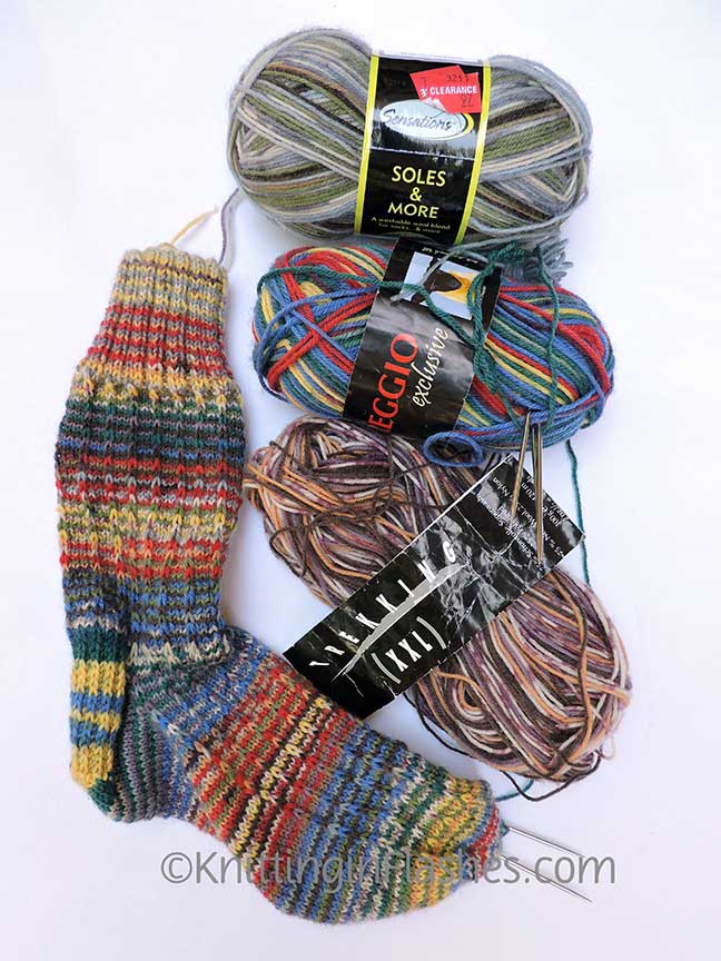 Yarns used: Soles & More in the green/blue colorway, Trekking XXL color 803 (orange/purple/brown), and Reggio exclusive self-striping yarn in primary colors #705.