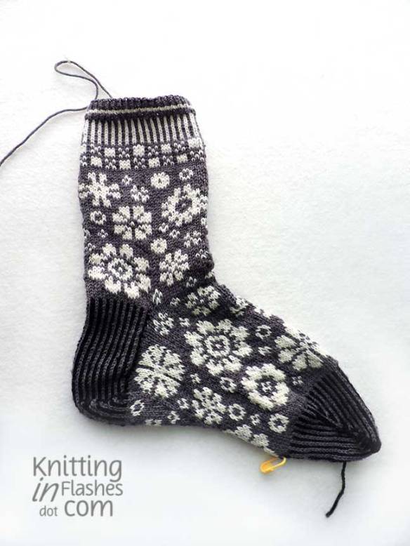 Between the bitterly cold temperatures, thawing frozen water pipes, a trip to the emergency room*, and shoveling eight inches of snow, I’ve got one Bloomin’ sock done, one Bloomin’ sock to go.