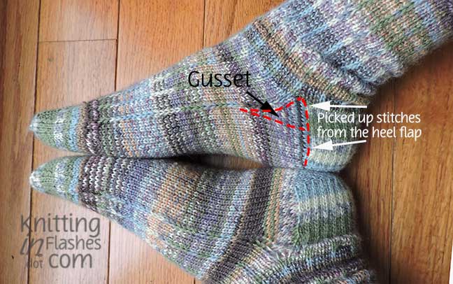 Usually, the gusset is on the side of the heel flap as shown here. You can see where I picked up the stitches from the heel flap to continue with the foot. It makes a triangle on the side. The gusset on these Bloomin’ socks is on the bottom so the pattern flows all around.