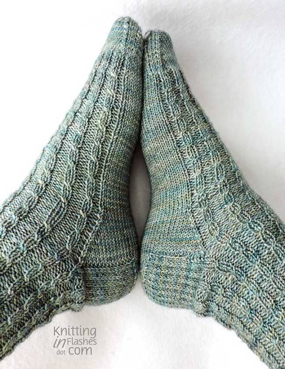 Knit Picks Hawthorne Multi yarn in the Cully colorway (color discontinued) is a soft green with hints of blue.I pretty much followed the pattern except for the heel flap. I have two favorite patterns that I like to use: the Slip-stitch heel flap and the Eye of Partridge heel flap. I decided on the slip-stitch one as it would flow better from the ribbed pattern into the heel flap.