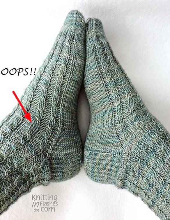 Helen suggested in her pattern to reverse the cabling from leaning to the right to the left for the second sock so they would be mirror images. So I did that as well.