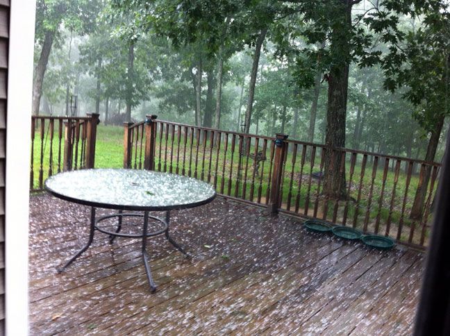 When I turned into the development where I live, it started to rain. Hard. Then I heard something hit my car roof. Just as I got into the garage, hail started coming down. It sounded like gravel hitting the roof of the house.